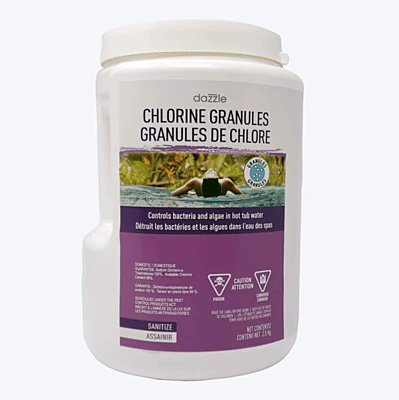 Fast-dissolving, totally soluble chlorine granules. Ideal for the immediate boosting of a chlorine residual that is too low or for shock treating when a strong chlorine-producing shock is needed. For the control of harmful micro-organisms in hot tub water. Can also be used as a principal santizing product when regular hand feed applications are desired.