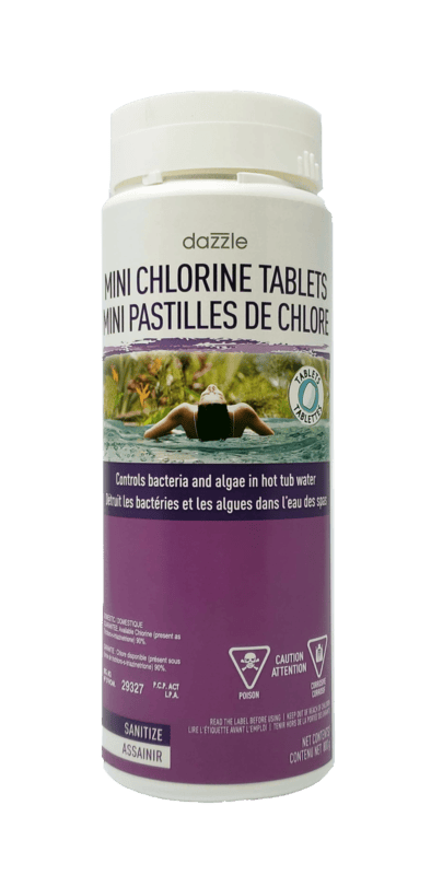 Dazzle Mini Chlorinating Tablets are 1″ chlorine tablets for hot tubs. Dazzle Mini Chlorinating Tablets are 100% slow-dissolving, stabilized tabs. For controlling bacteria in hot tub water. For use in auto chlorinators or in floating dispensers.