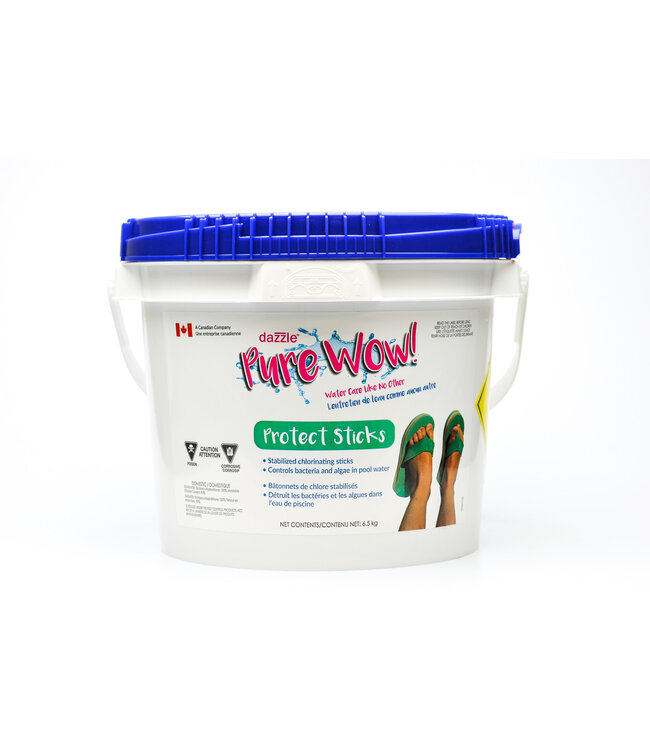 Dazzle PureWow Protect Sticks are 250g cylindrical stabilized chlorinating sticks that are perfect for those who want longer-lasting skimmer feed to control algae and bacteria in pool water. The container has a total of 2kg of these sticks that can be used with auto chlorinators and floaters in smaller water volumes. Additionally, they serve as a chlorine/stabilizer booster for salt-chlorinated pools. It is recommended to use these sticks as Step 3 of the Pure Wow System.